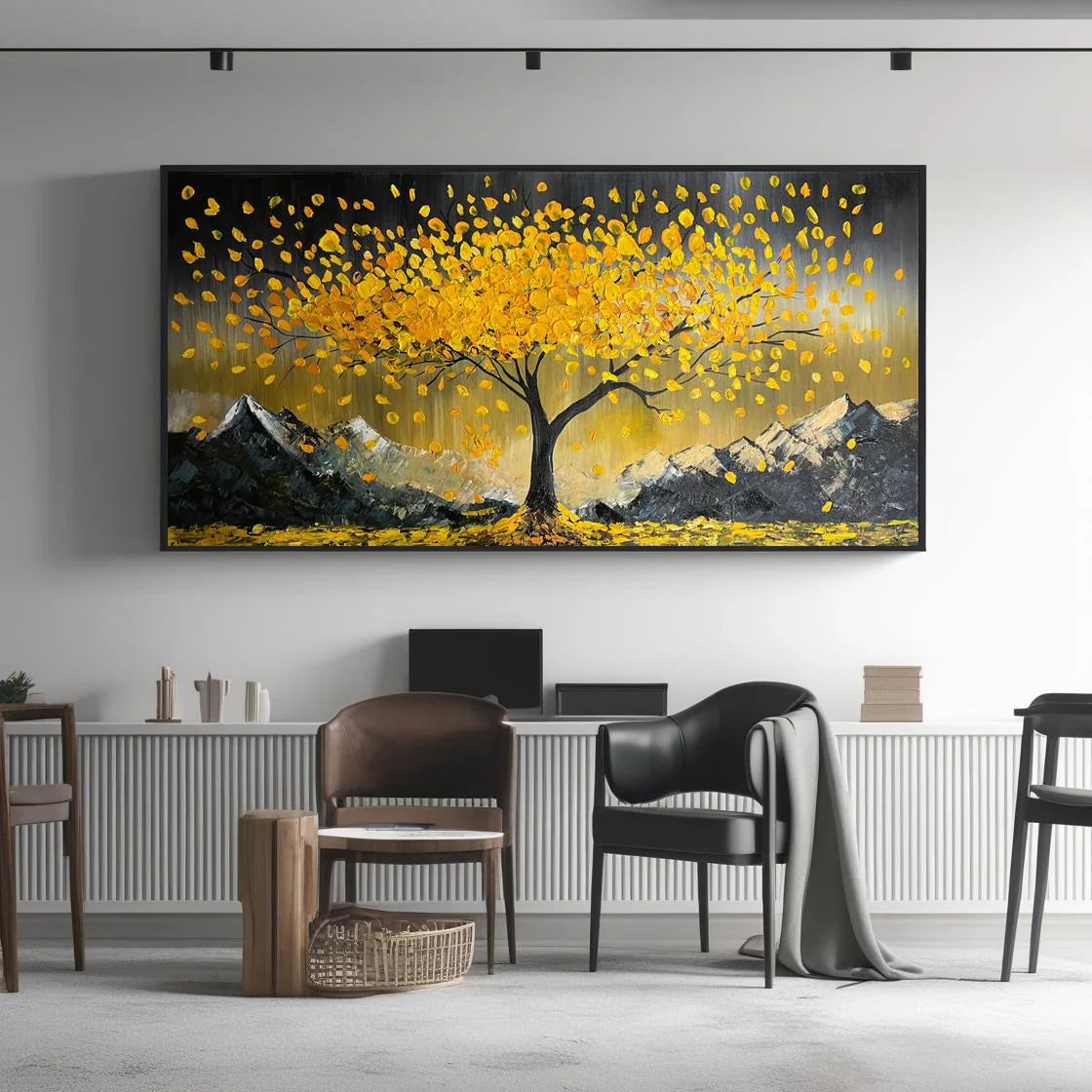 Golden magnolia tree artwork – handcrafted pen & wash nature illustration (14x14 in)