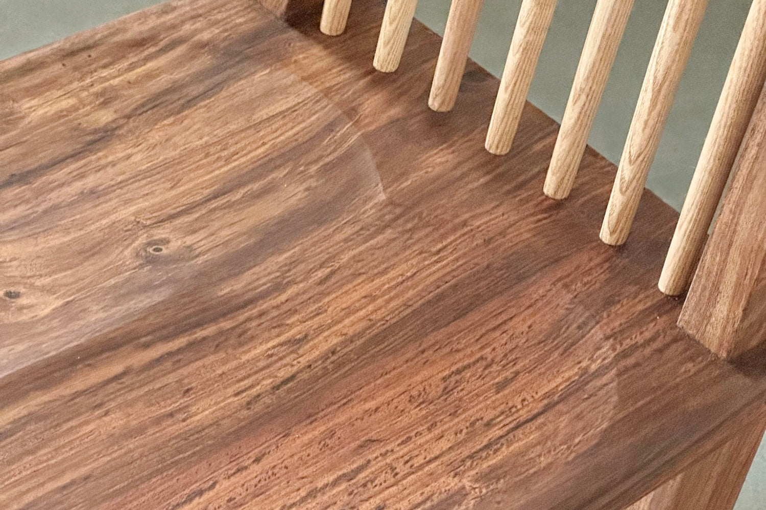 The item is made in rosewood with back spindles in white ash. The chair is finished using a belgian oil. The oil brings out the natural color of the wood and also acts as sealant providing protection against spills & stains.