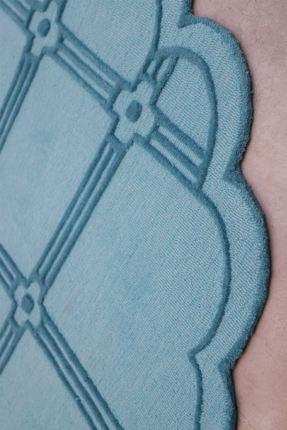 Made using the softest materials- wool and bamboo silk, it is entirely hand tufted by creating high and low elevations to the rug. The colour palette predominantly depicts the dusty turquoise shade of the doors in Kochi.