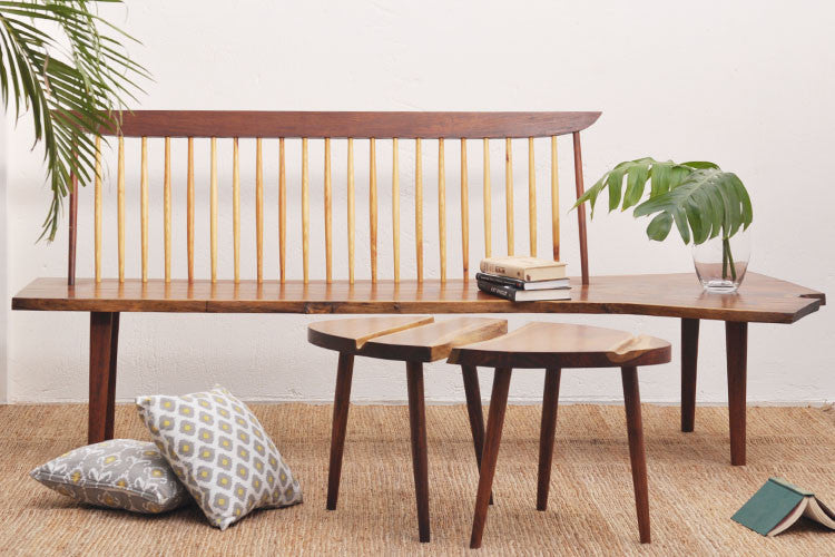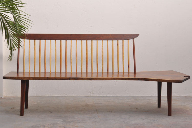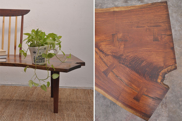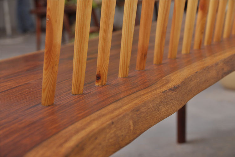 The Natura Bench epitomizes timeless elegance, featuring a spindle back and sturdy construction that celebrate the natural live-edge of the tree. With its rustic charm and modern sophistication, it adds a touch of natural beauty to any space. This variation features a seating area with a consistent width, gradually flaring open towards one end, adorned with a slightly smaller slab compared to the Natura Bench Grande in Siris Wood. This intentional design creates perfect spots for showcasing decorations such as plants or other decor items in the flared open end.